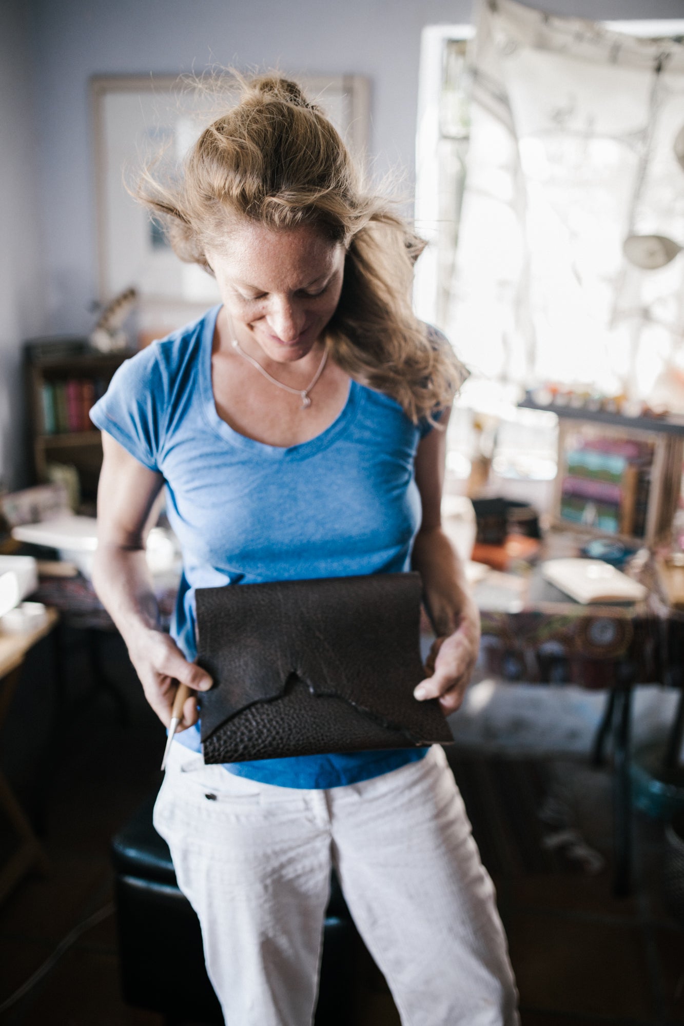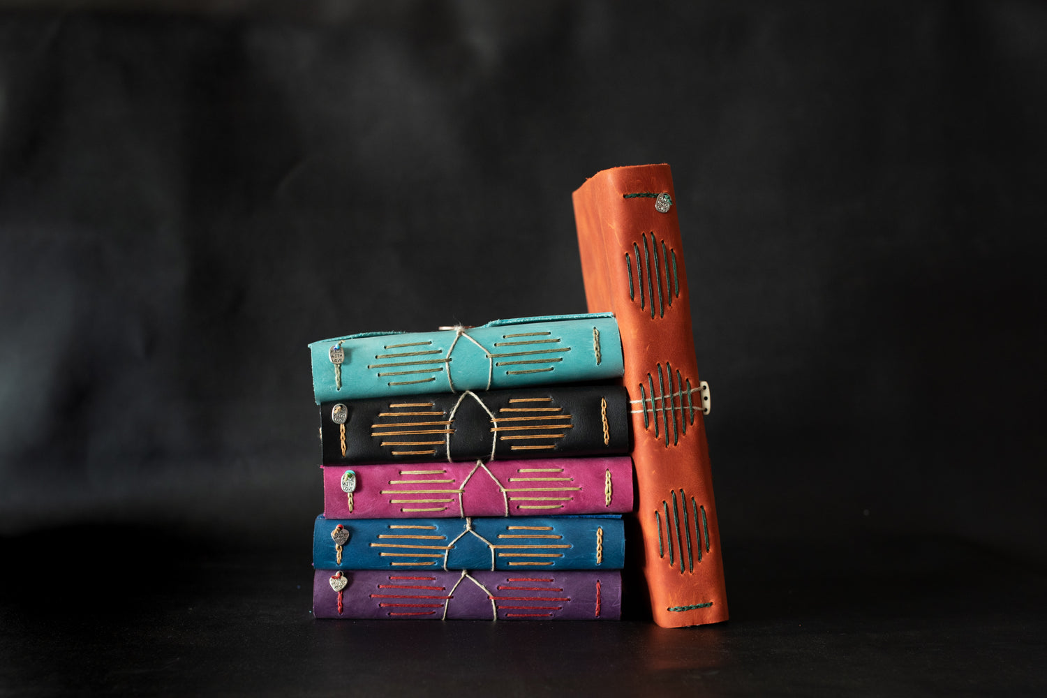 The journals are bound with durable, waxed, linen thread, allowing the pages to lie flat when open, making writing, painting, and sketching easy. Some of the pages are made of strong, long-fiber paper known for its archival quality and timeless appeal. Other journals have recycled paper and Embellished with handmade decorative end-papers, hand-dyed ribbons, and carefully sourced beads and buttons from artists around the world, many of whom I have met! The leather is from Tandy Leather in the U.S.A. and from Leon, shoe making capital of Mexico.