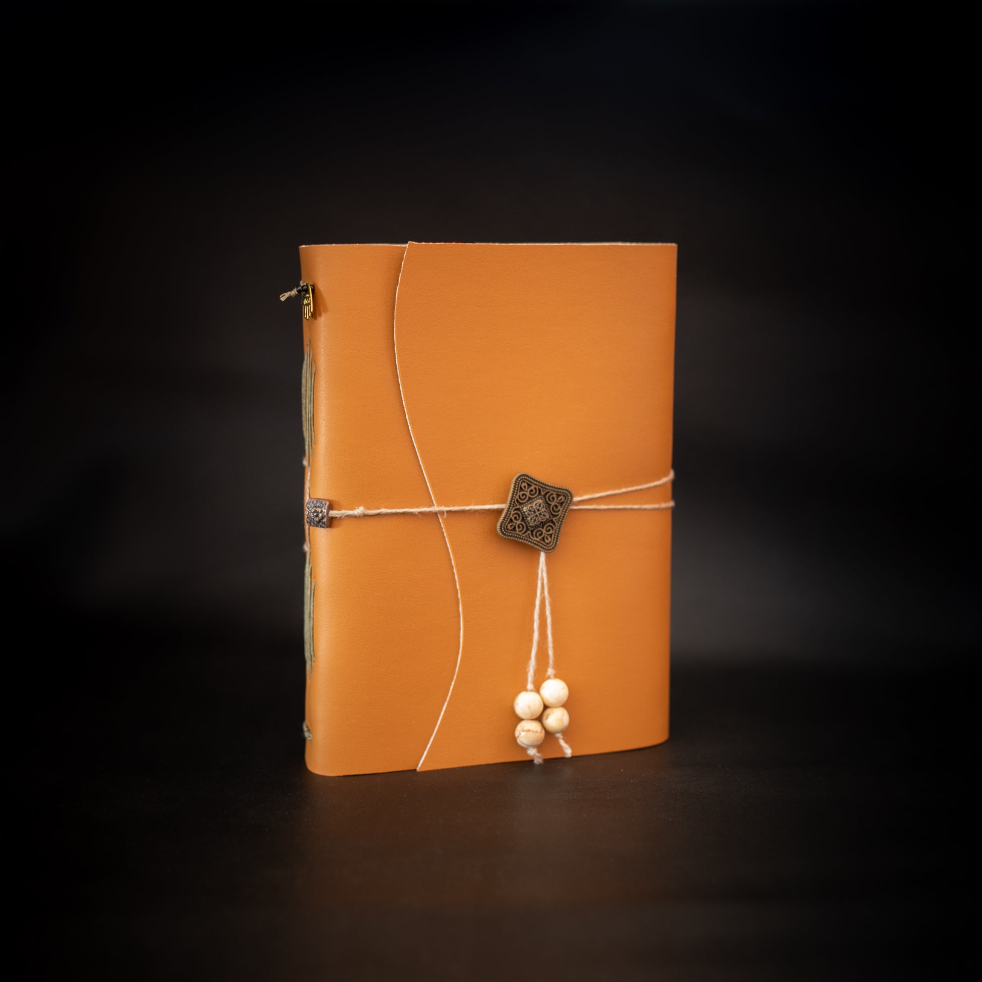 Crafted for heavy use. The decorative stitching on the spine is medieval German binding with durable, waxed, linen thread, allowing the pages to lie flat when open. The pages are made of strong, long-fiber brown paper. Embellished with handmade decorative end-papers and carefully sourced, beads and buttons. The leather is from the finest tanneries in Mexico.