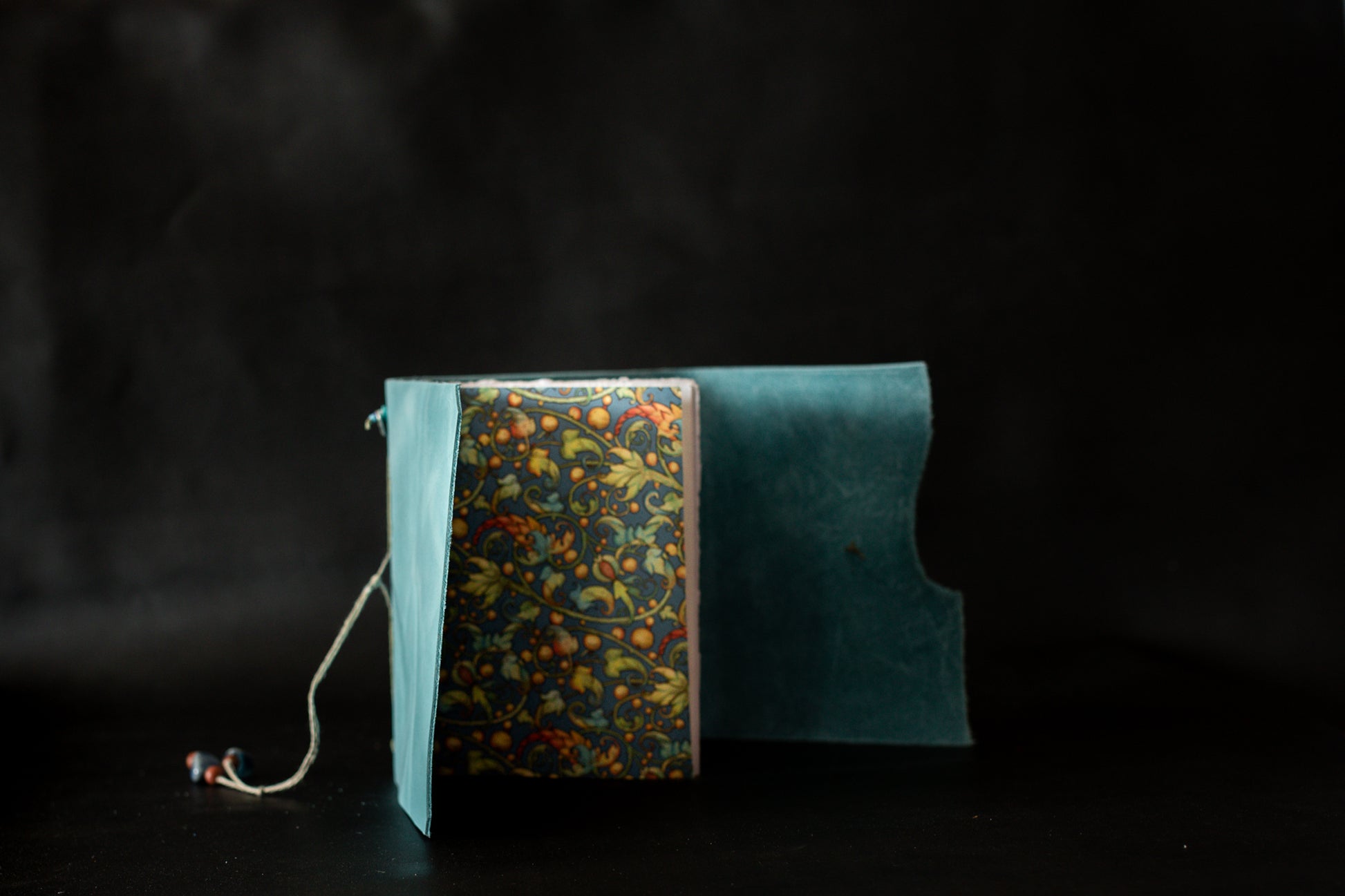 Crafted for heavy use. The decorative stitching on the spine is medieval German binding with durable, waxed, linen thread, allowing the pages to lie flat when open. The pages are made of strong, long-fiber brown paper. Embellished with handmade decorative end-papers and carefully sourced, beads and buttons. The leather is from the finest tanneries in Mexico.